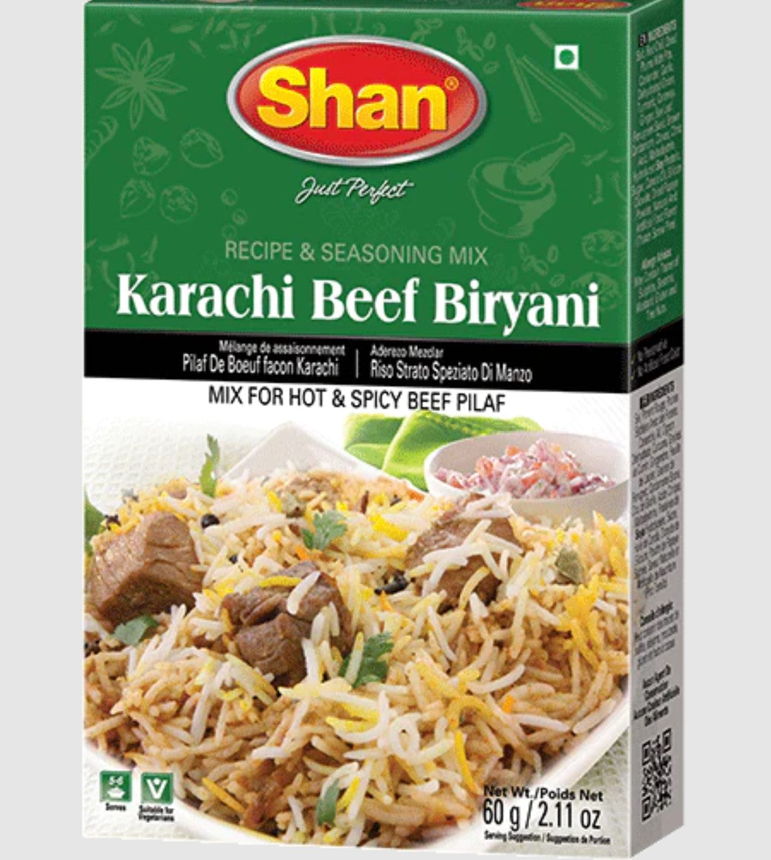 **Shan Karachi Beef Biryani (60g)** is a spice blend created to make Karachi-style beef biryani, a famous and flavorful biryani variant from Karachi, Pakistan. This spice mix captures the unique taste of Karachi biryani, known for its robust and spicy flavor, with hints of tanginess that make it distinct from other biryanis.