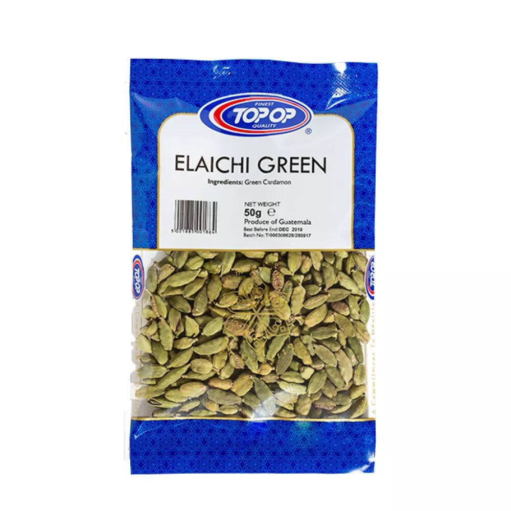 Topop Elaichi Green (Cardamom Whole) 50g is a premium quality spice, widely regarded as the "Queen of Spices" due to its rich aroma and versatile use in both sweet and savory dishes. Green cardamom, known for its distinctively sweet and floral flavor, is commonly used in Indian, Middle Eastern, and Scandinavian cuisines.
