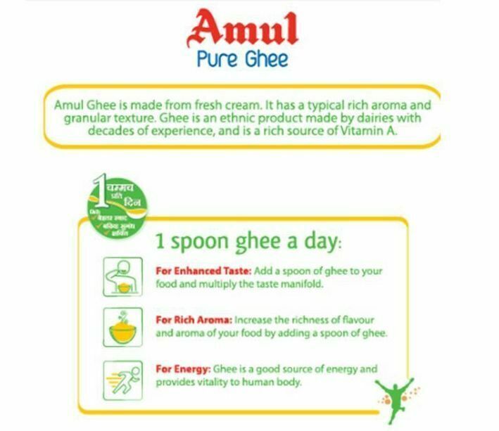 Purity and Quality: Amul is a renowned dairy cooperative in India, and their pure ghee is expected to adhere to high-quality standards. It is likely to be free from additives and preservatives, ensuring a wholesome and natural product.